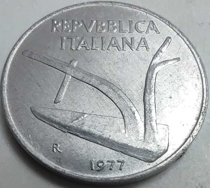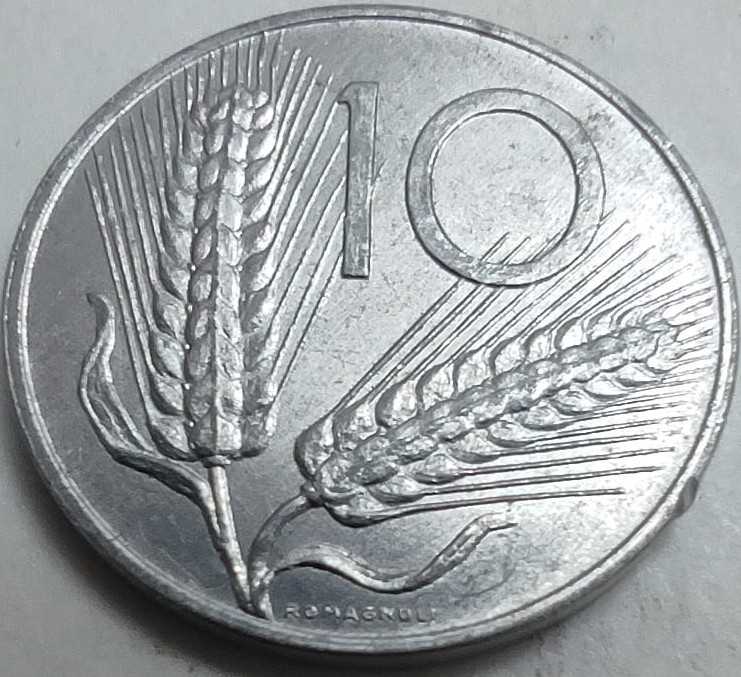 İtalyan nümismatiğinin en uzun süre tedavülde kalan tasarımlarından biri olan bu 10 Liret, sadeliğiyle zarafeti birleştirir. Paranın ön yüzünde (obverse), barışı ve İtalya'nın Akdeniz kimliğini simgeleyen, üzerinde iki büyük zeytin tanesi bulunan bir Zeytin Dalı yer alır. Arka yüzünde (reverse) ise sapından tutulan bir Pulluk (saban) figürü bulunur; bu figür, İtalya'nın tarımsal köklerini ve emeği temsil eder. "Italma" adı verilen, alüminyum ve magnezyum karışımı çok hafif bir alaşımdan üretilmiştir. Bu alaşım sayesinde para, geniş boyutuna rağmen tüy kadar hafiftir. 1977 baskısı, bu serinin en yoğun kullanıldığı yıllardan biridir.