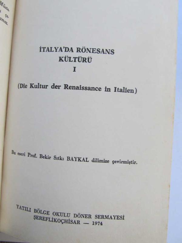 Kitap 1974 yılında YATILI BÖLGE OKULU DÖNER SERMAYESİ tarafından [ŞEREFLİKOÇHİSAR] yayınlanmıştır. Bu baskının çevirisi SITKI BAYKAL tarafından yapılmıştır. İTALYA'DA RÖNESANS KÜLTÜRÜ 1 adlı eser Türkçe dilindedir.