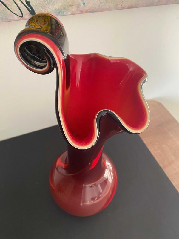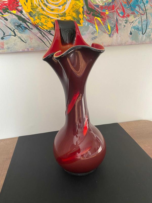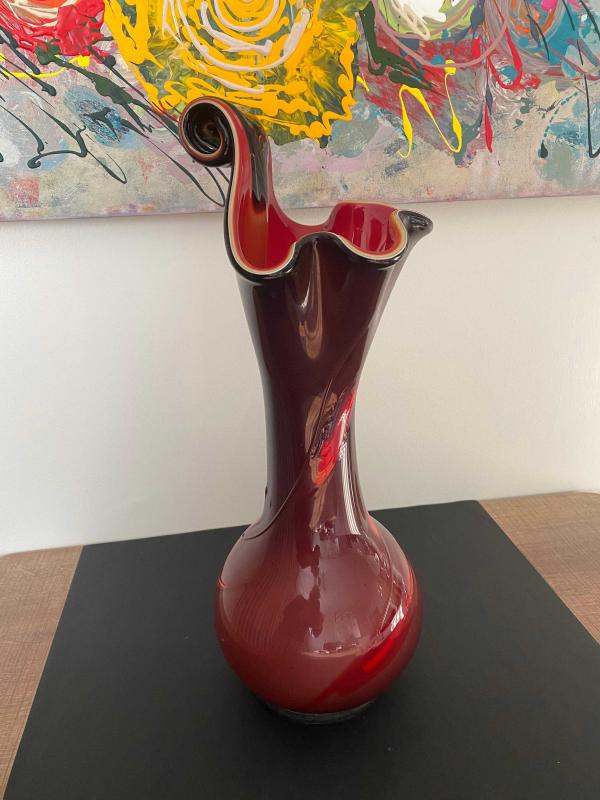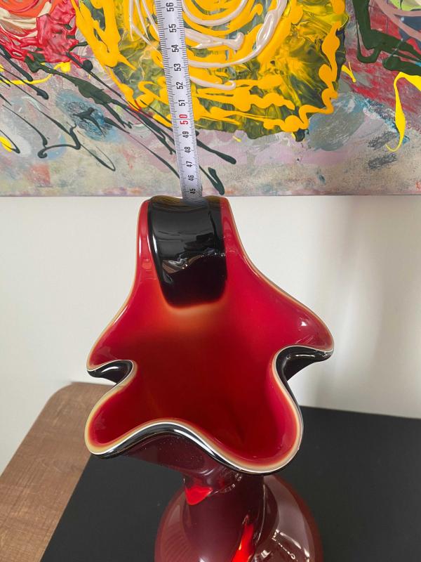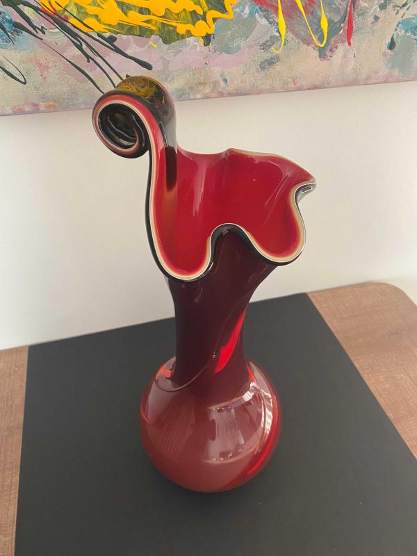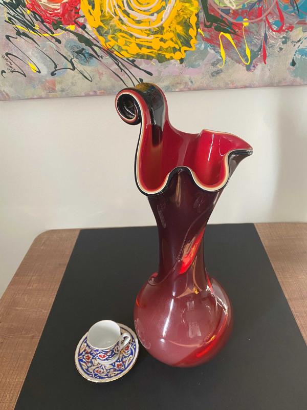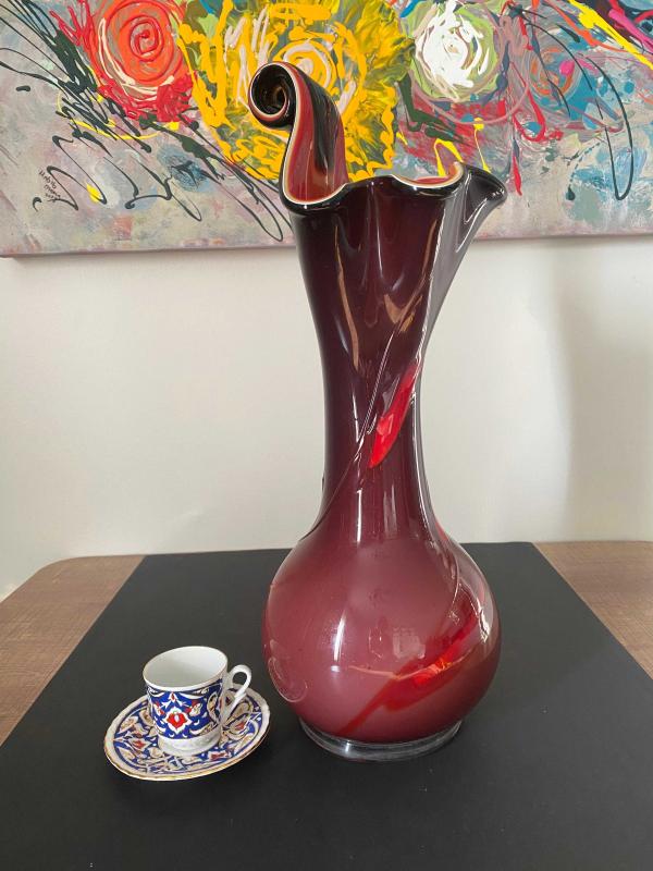 NADİR İMALAT - İTALYAN MURANO SOMMERSO VAZO. . İkonik bir büyük boy ( 46 cm ) “arum zambağı” ya da “balık kuyruğu” formunda 1960’lı yıllardan çok özel bir İtalyan Murano vazo. . Adını bir bitkiden alan bu form, yukarıya doğru kıvrılan "kamçı" (curled lip) ve dalgalı ağız yapısıyla karakterizedir. . "Sommerso" veya katmanlı cam tekniğiyle cam sanatının ustaları tarafından üretilmiş. . İç kısımdaki canlı kırmızı / nar çiçeği tonu, dıştaki koyu bordo/vişne tonuyla harika bir derinlik oluşturmuş. . Boyutu 46 cm yükseklikte. Görkemli ve dev boyutta. . Mekanınıza hem vintage bir ruh hem de modern bir sanat dokunuşu katacak bu parça, özellikle gün ışığında büyüleyici bir renk oyununa dönüşüyor. El işçiliğinin zirvesi, zamansız bir dekoratif obje .