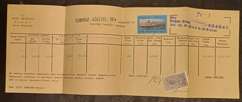 İZMİR BELEDİYESİ ESHOT GENEL MÜDÜRLÜĞÜ ELEKTRİK TAHSİLAT MAKBUZU 1975 - TÜRK DONANMA VAVKI PULLU, 2 saat önce satışa sunulmuştur.