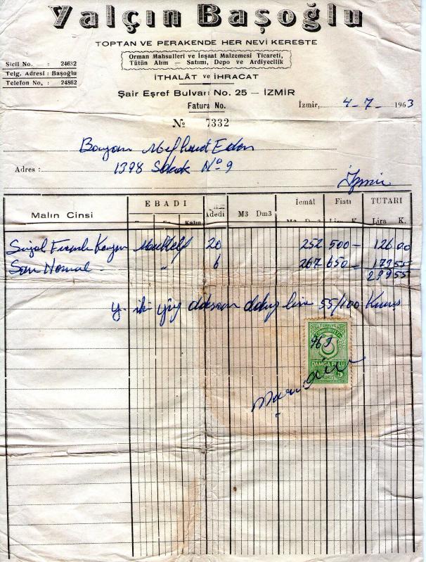İZMİR FATURA 1963 MÜHENDİS HÜSEYİN YÜCEL, 2 yıl önce satışa sunulmuştur.