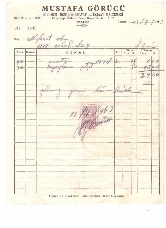 İZMİR FATURA MEFARET ETEN MUSTAFA GÖRÜCÜ 1963, 12 gün önce satışa sunulmuştur.