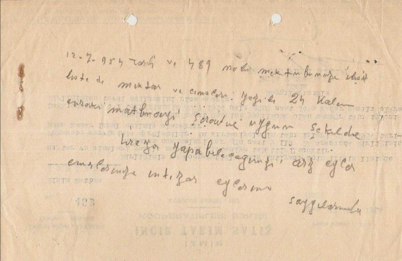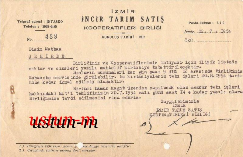 ** İZMİR İNCİR TARIM SATIŞ KOOPERATİFİ YAZIŞMA ** Gayet iyi kondüsyonda,altta imzalı kooperatif yazışmasıdır...
