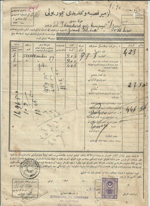 ** İZMİR KASABA VE TEMDİDİ DEMİRYOLU ŞİRKETİ ** A4 ebadında diyebileceğim,üstte Osmanlıca antetli, Standard Gaz Kumpanyası Akhisar Ziraat Bankası adına taşınan malzemenin hamule senedidir.. Altta bir adet Osmanlı fiskal pulludur.. 8 Haziran 1929 tarihi görülmekte.. Kondüsyon yaşına göre gayet iyidir...