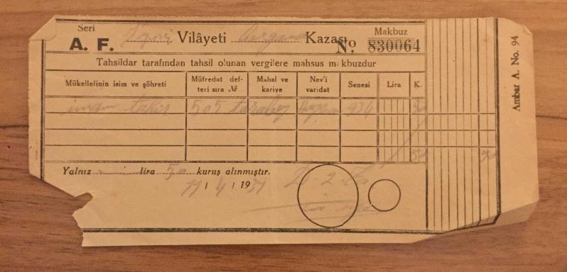 İZMİR VİLAYETİ, BERGAMA KAZASI - TAHSİLDAR TARAFINDAN TAHSİL OLUNAN VERGİLERE MAHSUS MAKBUZDUR - 1939 TARİHLİ, 2 saat önce satışa sunulmuştur.