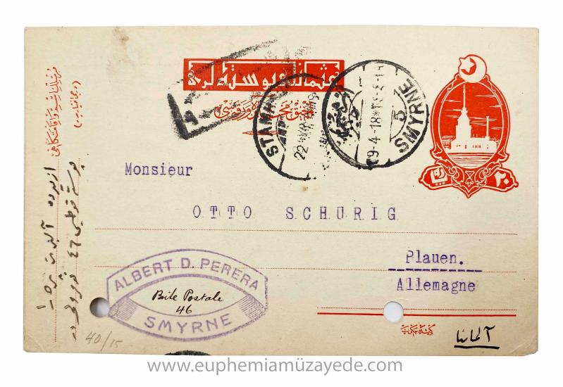 Osmanlı Postaları Kız Kulesi vinyetli, İzmir'de (Smyrne) posta kutusu 46 numaralı adreste ikamet eden tüccar Albert D. Perera'dan Almanya'nın (Allemagne) Pleuen kasabasında Otto Schurig isimli tüccarla ipek danteller konulu ticari yazışma. 9 Nisan 1918 tarihli Osmanlıca ve Fransızca çift dilli posta damgalı, 22 Nisan Stamboul (İstanbul) damgalı, daktilo ile yazılmış, el yazısı ile eklemeler yapılmış Fransızca antiye. 24x9 cm, üzeri delgeç delikli, çok temiz durumda.