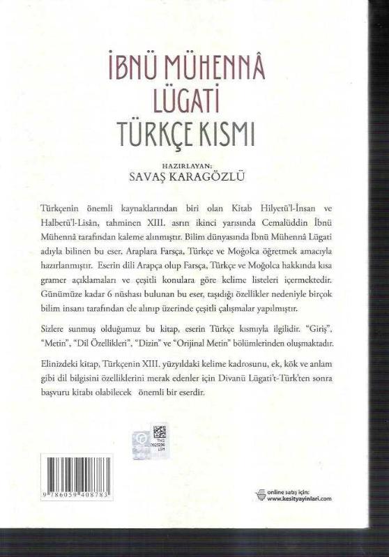 İbnü Mühenna Lügati Türkçe Kısmı, Savaş Karagözlü tarafından kaleme alınmıştır. Kitap 2023 yılında Kesit Yayınları tarafından [İstanbul] yayınlanmıştır. 423 sayfadır. Sayfa bilgisi 2. hamur olarak belirtilmiştir. İbnü Mühenna Lügati Türkçe Kısmı adlı eser Türkçe dilindedir.