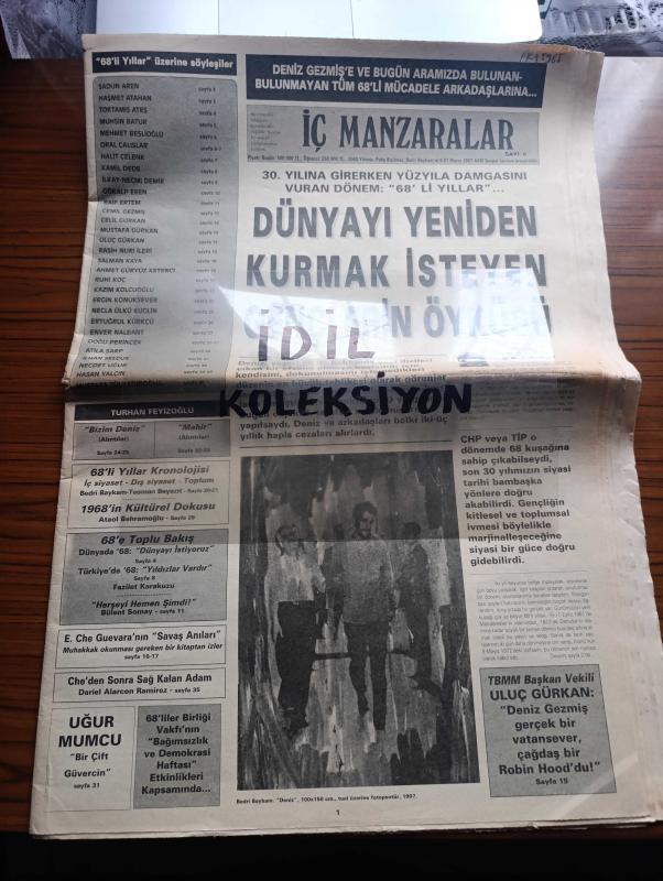 İç Manzaralar Gazetesi - Turkish Newspaper - 6 31 Mayıs 1997 - Deniz Gezmiş'e ve bugün aramızda bulunan bulunmayan tüm 68'li mücadele arkadaşlarına - Deniz Gezmiş'in babası Cemil Gezmiş Allah herkese böyle bir evlat nasip etsin fotoğraf - 68'li yıllar üzerine söyleşiler - Mahir Çayan - 1968'in kültürel dokusu yazan Ataol Behramoğlu - Ernesto Che Guevara'nın savaş anıları yar yayınları - Che'den sonra sağ kalan adam yazan Dariel Alarcon Ramirez - Uğur Mumcu Bir çift güvercin - Bedri Baykam Deniz 100*150 cm tual üzerine fotopentür- Devrimci Kemalist Bakış - 68'liler Birliği vakfının başkanı Haşmet Atahan fotoğraf - Avukat Halit Çelenk için idam gecesinin acıları hiçbir zaman dinmeyecek - THKP-C Ordu içinde subayları olan ve darbe pazarlıkları yapan bir kuvvetti - eylemci militan gençlerden Kamil Dede fotoğraf - Rasih Nuri İleri tüm dünyada Sovyetlerin tek dostu Türkiye'ydi - Dr. Ruhi Koç Dev Genç'in en hızlı militanlarındandı - 1960 1972 kronoloji - Necla Ülkü Kuglin - Talat Aydemir, Bedri Baykam tarafından kaleme alınmıştır. İç Manzaralar Gazetesi - Turkish Newspaper - 6 31 Mayıs 1997 - Deniz Gezmiş'e ve bugün aramızda bulunan bulunmayan tüm 68'li mücadele arkadaşlarına - Deniz Gezmiş'in babası Cemil Gezmiş Allah herkese böyle bir evlat nasip etsin fotoğraf - 68'li yıllar üzerine söyleşiler - Mahir Çayan - 1968'in kültürel dokusu yazan Ataol Behramoğlu - Ernesto Che Guevara'nın savaş anıları yar yayınları - Che'den sonra sağ kalan adam yazan Dariel Alarcon Ramirez - Uğur Mumcu Bir çift güvercin - Bedri Baykam Deniz 100*150 cm tual üzerine fotopentür- Devrimci Kemalist Bakış - 68'liler Birliği vakfının başkanı Haşmet Atahan fotoğraf - Avukat Halit Çelenk için idam gecesinin acıları hiçbir zaman dinmeyecek - THKP-C Ordu içinde subayları olan ve darbe pazarlıkları yapan bir kuvvetti - eylemci militan gençlerden Kamil Dede fotoğraf - Rasih Nuri İleri tüm dünyada Sovyetlerin tek dostu Türkiye'ydi - Dr. Ruhi Koç Dev Genç'in en hızlı militanlarındandı - 1960 1972 kronoloji - Necla Ülkü Kuglin - Talat Aydemir adlı eser Türkçe dilindedir.