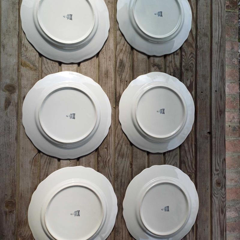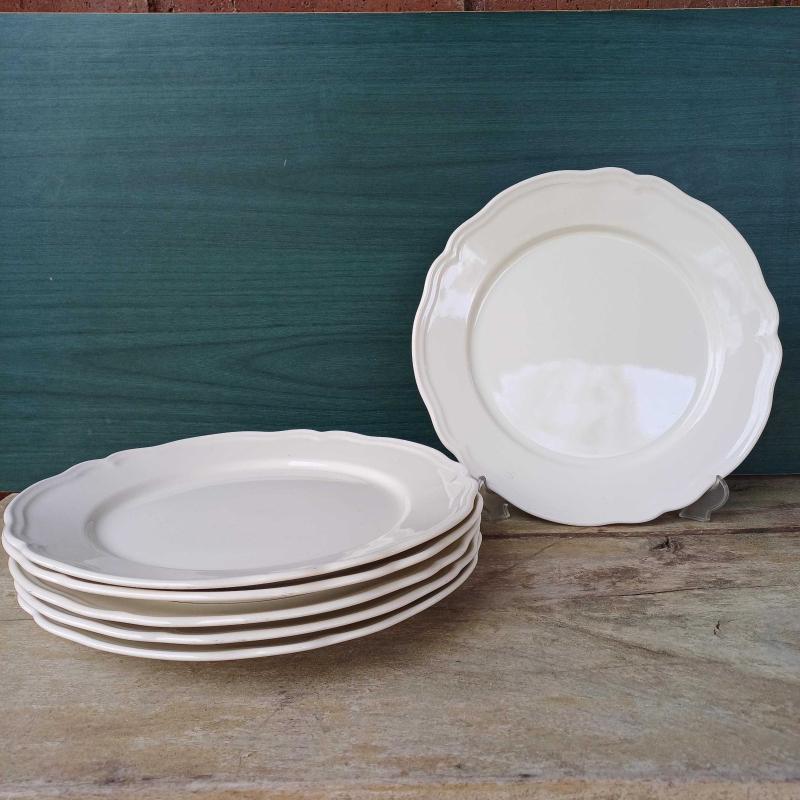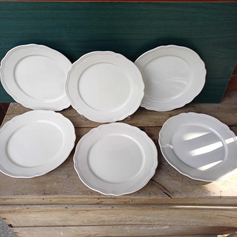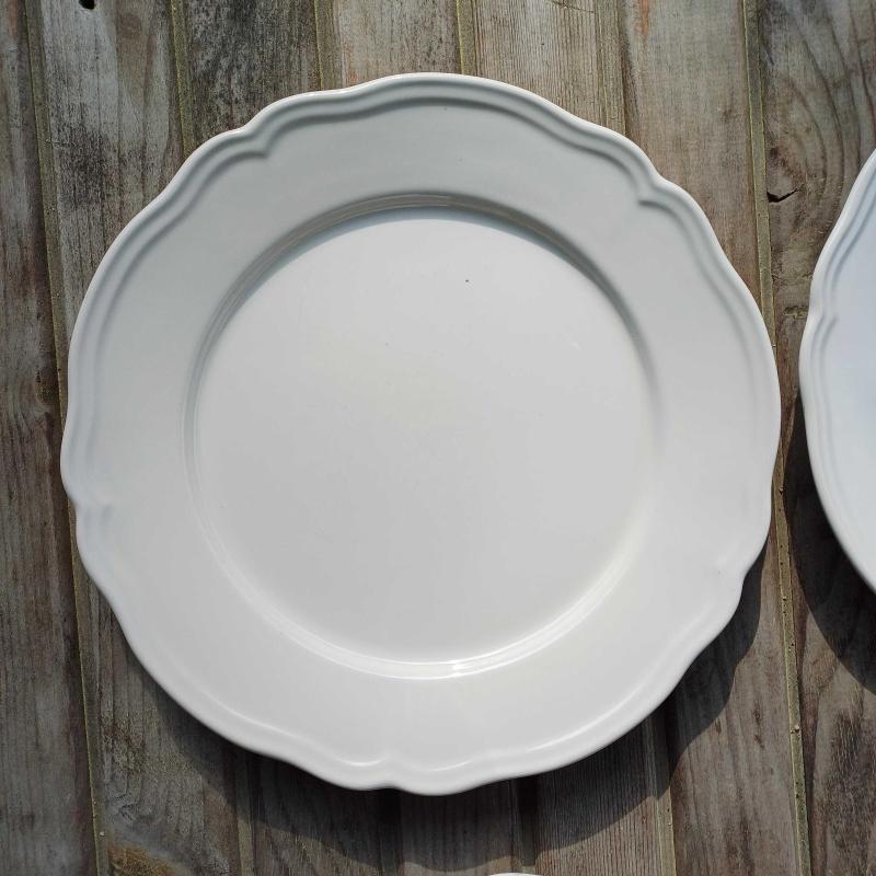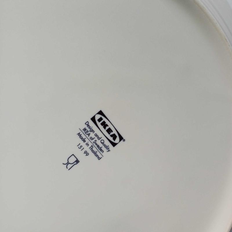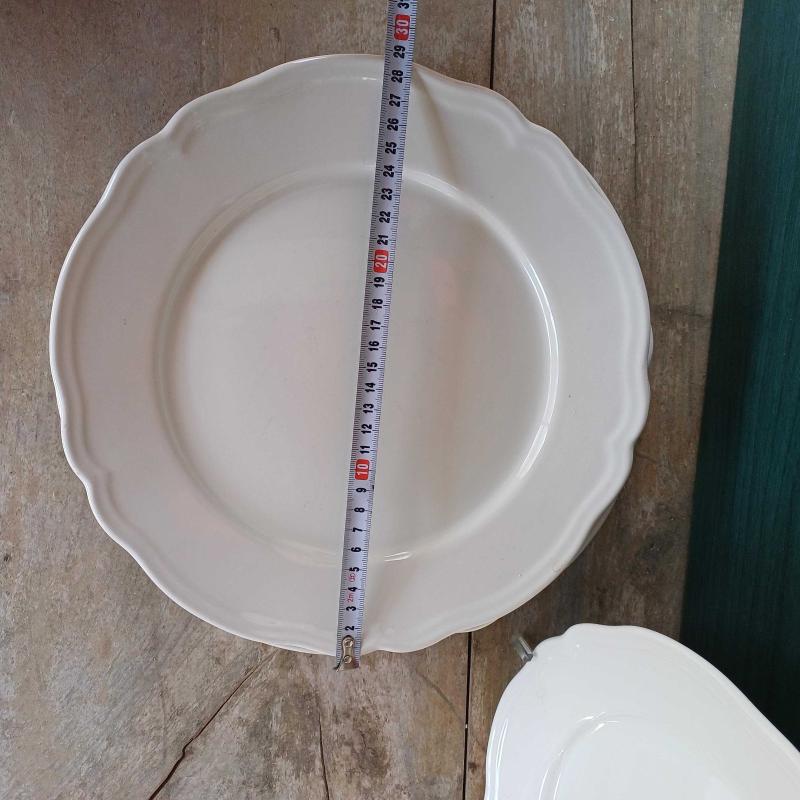 Ikea marka. Ekru renk. Kenarlari dekoratif bordürlu. 28 cm capinda servis tabakkari. Vintage. Kondisyonlari iyi.Atik,kırik,catlak YOK. Ancak kullanima dair cizikler mevcut.Yüzeyde kullanima bagli siyah cizgiler de mevcut,kiminde az kiminde çok(bkz fotolar)