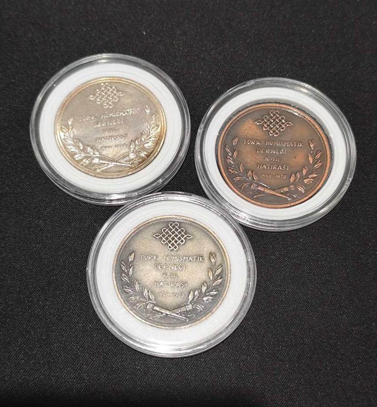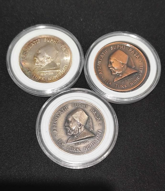Türk Nümismatik Derneğinin 10. Yıl Hatırası olarak basılan, İlk Nümismat Abdüllatif Suphi Paşa Madalyonlar set. 1 Adet Gümüş 1 Adet Okside Gümüş 1 Adet Bronz. Nadir bir settir. Sadece 136 adet basım sayısı vardır. Kondisyonlar çil.