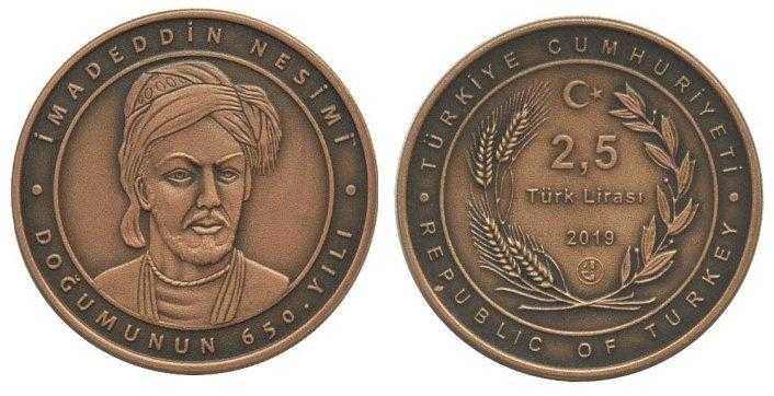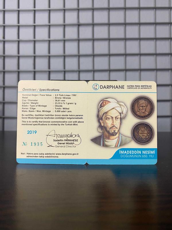 İmadeddin Nesimi Doğumunun 650. Yılı Hatıra Para Sertifikalı 2019 (Bronz)