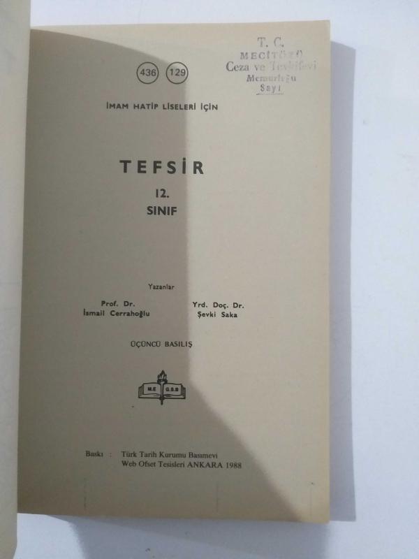 İmam Hatip Liseleri İçin TEFSİR 12. Sınıf, İSMAİL CERRAHOĞLU, ŞEVKİ SAKA tarafından kaleme alınmıştır. Kitap 1988 yılında MEB ( Milli Eğitim Bakanlığı Yayınları ) tarafından [ANKARA] yayınlanmıştır. 187 sayfadır. İmam Hatip Liseleri İçin TEFSİR 12. Sınıf adlı eser Türkçe dilindedir.