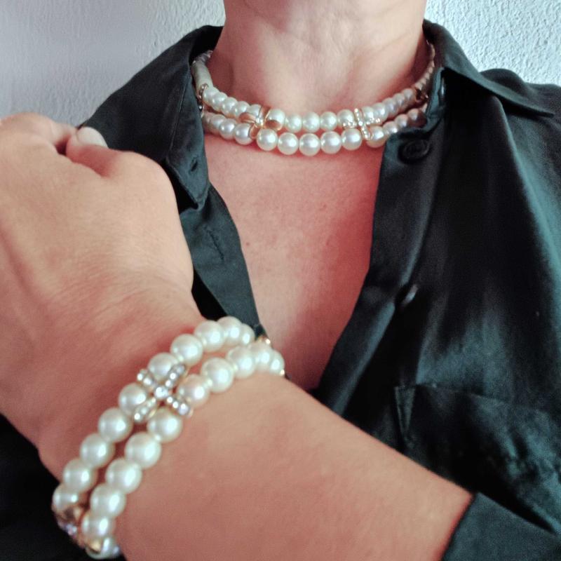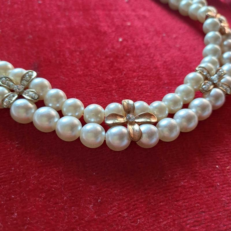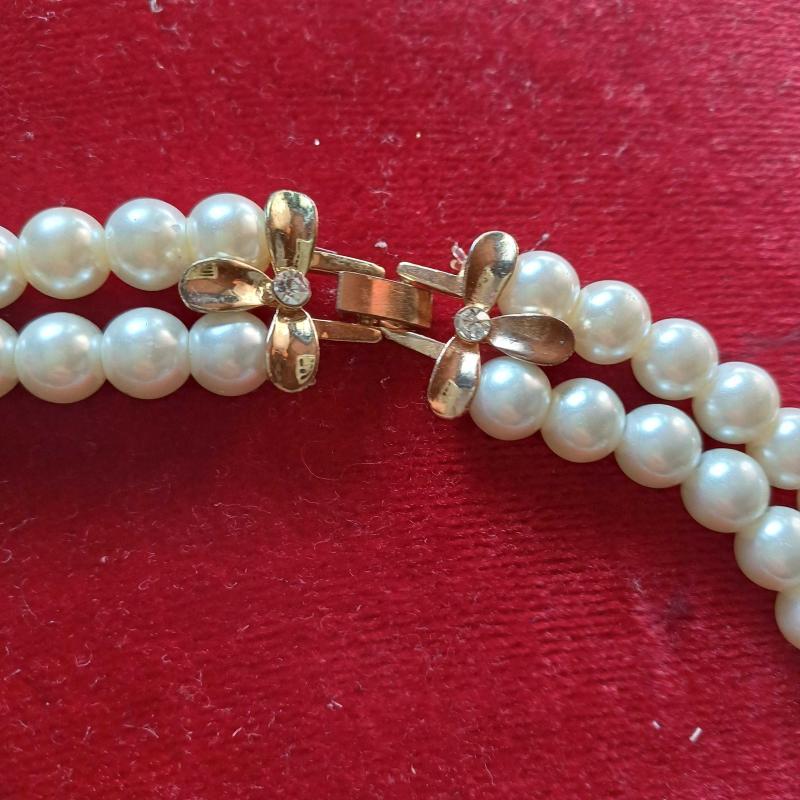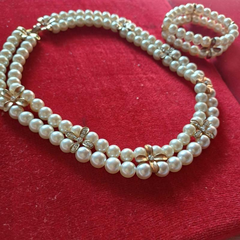 Suni inci ,gold rengi metal parcalar ve seffaf kristallerden olusan vintage kolye ve bileklik takımı. Kolye gerdanlik hatta tasma yani choker seklinde boyuna tam oturuyor.(bkz foto). Çift sira 2 boy inci ve kristal taşli gold metal aparatlardan olusuyor. Cok ozel ,ara parcalarla ayni tasarimda cicekli bir kilidi var. Bileklik de ayni sekilde tasarlanmis. Seffaf misinaya dizilmis. Kullanilmus bir üründür.CIL DEGILDIR. Bileklik 17 cm bilekler icin uygun.Sert bir misina cok fazla esnemiyor. Kolye en kisa cevresi 37 cm. Inciler agirlikli olarak beyaz Ancak kendi iclerinde cok hafif ton farklari mevcut. Ayni sekilde bileklik de agirliklı olarak beyaz arada birkac tane ucuk pembe veya açık gri inciler var. Urun sert br misinaya dizili.Boşta iken sert ve biraz sekli köseli gibi gorunuyor ancak boyuna çok güzel oturuyor. Lütfen tüm bu özellikler kabulunuz ise sipariş veriniz.
