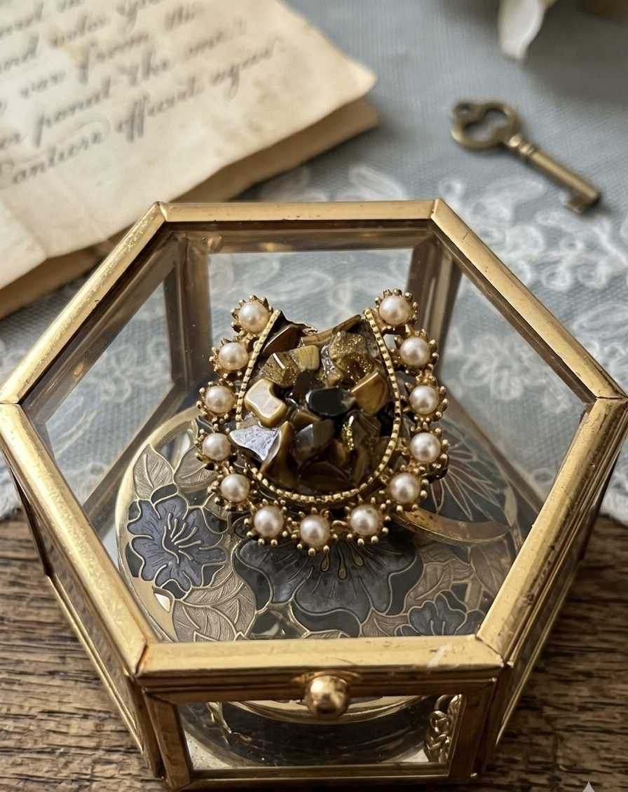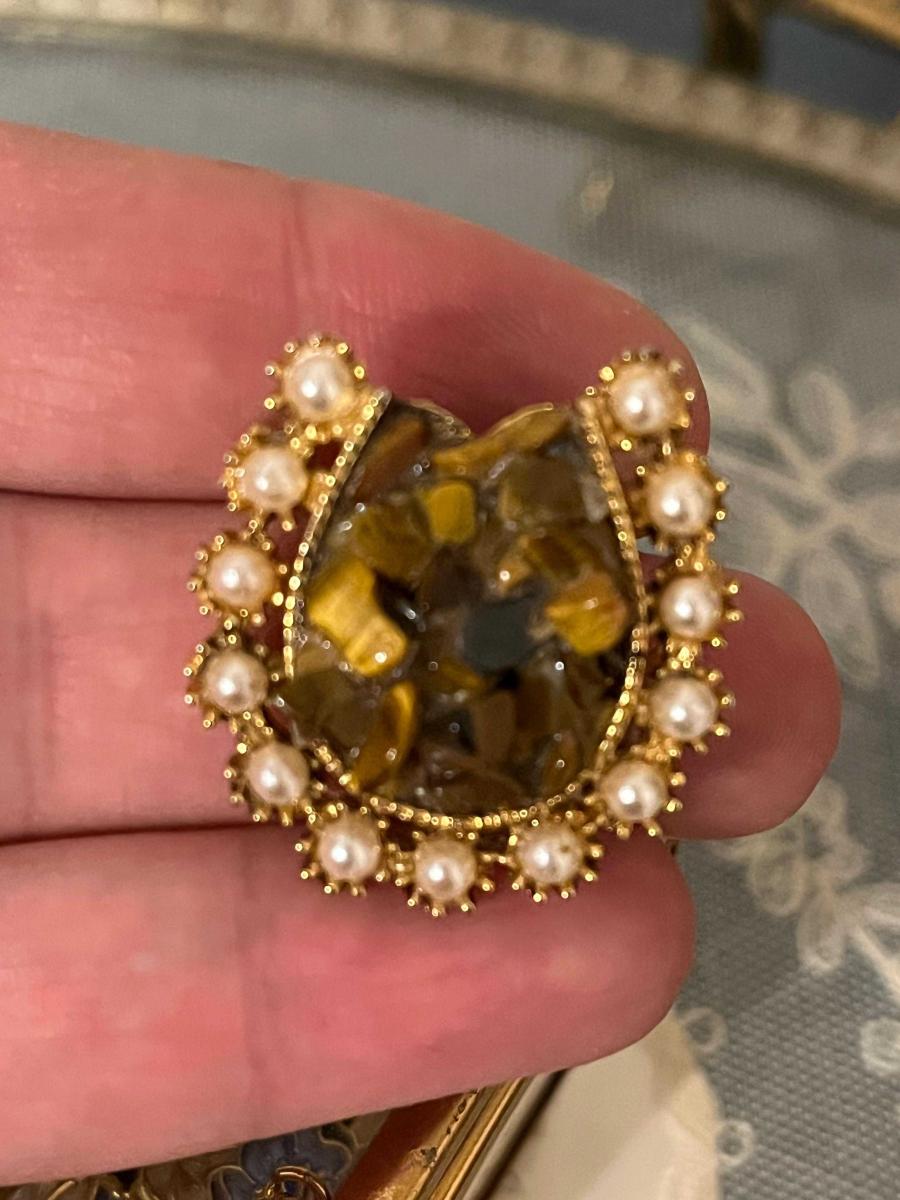 İngiliz mücevher markası "Exquisite" tarafından 1950’ler de üretilmiş vintage bir broştur. Ortasındaki kaplan gözü doğal taşı ve kenarlarındaki sahte incilerle at nalı şeklinde yapılmış bir şans broşudur