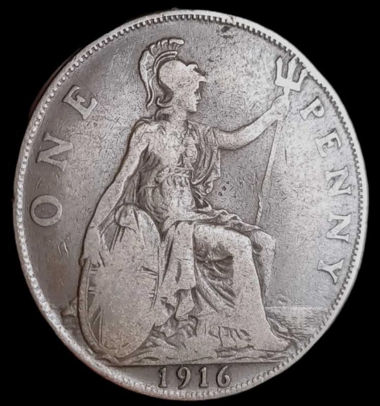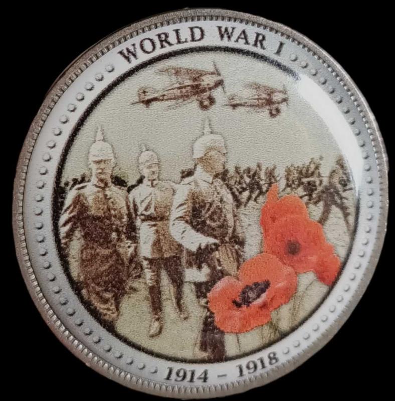 İngiltere 1916 1 Dünya Savaşı Damla baskı 1 Penny Alman askerleri ve üstlerinde uçaklar resmedilmiştir; ayrıca savaşın sembolü olan kırmızı gelincik çiçekleri bulunmaktadır