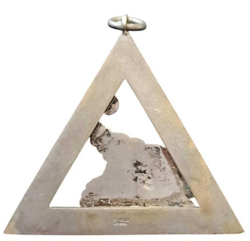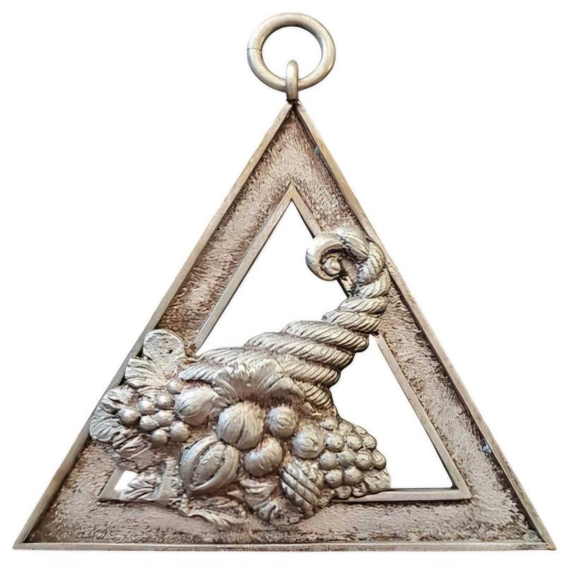 İngiltere (Londra), Masonik Nişan-Broş Tarzı Kolye. "Cornucopia" Bereket Boynuzu Sembolü Temalı. 20. Yüzyıl Ortaları. Gümüş Kaplama Prinç. Üçgen Form ve Mükemmel Detaylı Bir İşçilikte. Üretici: Spencer-London.