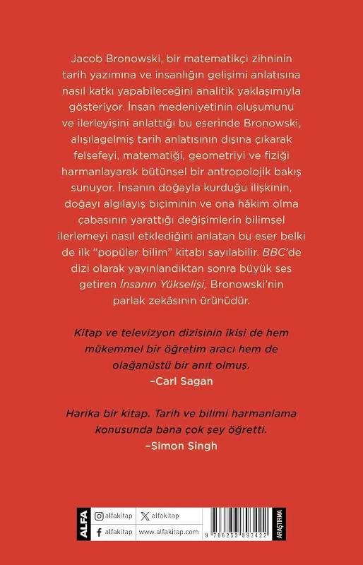 Jacob Bronowski, bir matematikçi zihninin tarih yazımına ve insanlığın gelişimi anlatısına nasıl katkı yapabileceğini analitik yaklaşımıyla gösteriyor. İnsan medeniyetinin oluşumunu ve ilerleyişini anlattığı bu eserinde Bronowski, alışılagelmiş tarih anlatısının dışına çıkarak felsefeyi, matematiği, geometriyi ve fiziği harmanlayarak bütünsel bir antropolojik bakış sunuyor. İnsanın doğayla kurduğu ilişkinin, doğayı algılayış biçiminin ve ona hâkim olma çabasının yarattığı değişimlerin bilimsel ilerlemeyi nasıl etklediğini anlatan bu eser belki de ilk “popüler bilim” kitabı sayılabilir. BBC’de dizi olarak yayınlandıktan sonra büyük ses getiren İnsanın Yükselişi, Bronowski’nin parlak zekâsının ürünüdür. Kitap ve televizyon dizisinin ikisi de hem mükemmel bir öğretim aracı hem de olağanüstü bir anıt olmuş. –Carl Sagan Harika bir kitap. Tarih ve bilimi harmanlama konusunda bana çok şey öğretti. –Simon Singh