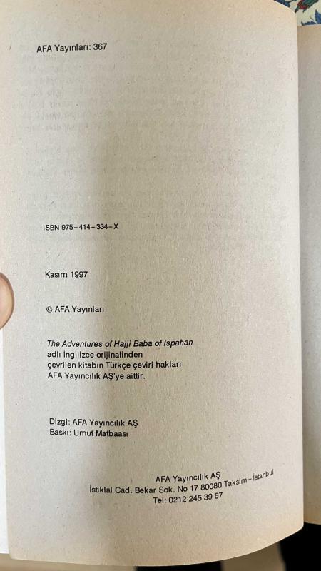 İsfahan'dan İstanbul'a Hacı Baba'nın Maceraları - James Morier - Afa Yayınları adlı eser, Kitap > Edebiyat, Kurgu > Mizah > Dünya Edebiyatı kategorisinde İkinci El olarak satıştadır.