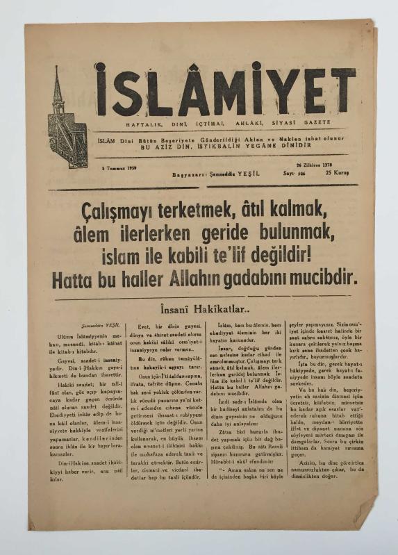 İslamiyet Gazetesi: Sayı 506 / 3 Temmuz 1959 (Çalışmayı Terk Etmek, Atıl Kalmak, Alem İlerlerken Geride Bulunmak İslam ile Kabili Te'lif Değildir!), Şemseddin Yeşil tarafından kaleme alınmıştır. İslamiyet Gazetesi: Sayı 506 / 3 Temmuz 1959 (Çalışmayı Terk Etmek, Atıl Kalmak, Alem İlerlerken Geride Bulunmak İslam ile Kabili Te'lif Değildir!) adlı eser Türkçe dilindedir.