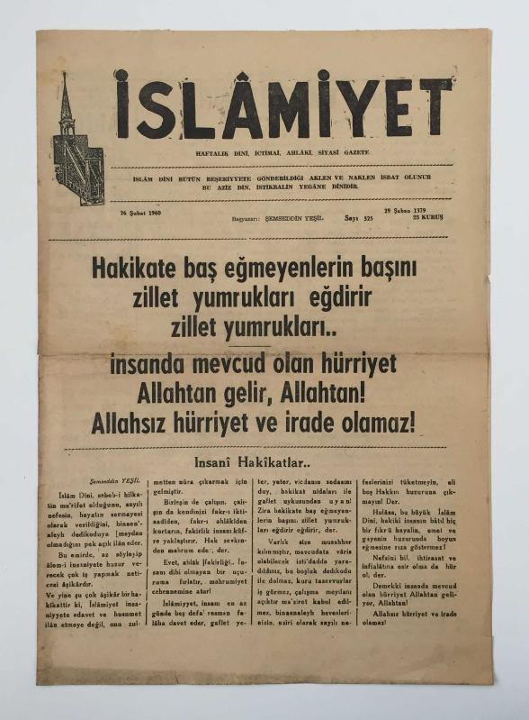 İslamiyet Gazetesi: Haftalık Dini, İçtimai, Ahlaki Gazete Baş Yazarı: Şemseddin Yeşil 4 sayfa 42 * 30 cm