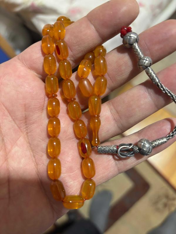 İsrafil erdoğmuş ustanın özel döküm malzemelerinde birebir Osmanlı benzetme sıkma kehribar tespih İsrafil erdoğmuş ustanın malzemelerini bilen bilir tespih elinize geldiğinde ne dediğimi anlarsınız patinleri üzerinde piyasa mallarıyla karıştırmayın lütfen özel malzemedir. Şuanda piyasada bulamazsınız tespih 4 senedir bende kayısı renkge dönmüş mükemmel bir çekimi vardır. Piyasa malı olmadığı için fiyat uygun değildir. 1000 ayar gümüş kazaklı püskülsüz 14 grama yakın 7 * 11 mm ölçülerinde alan çok memnun kalacağından emin olabilir