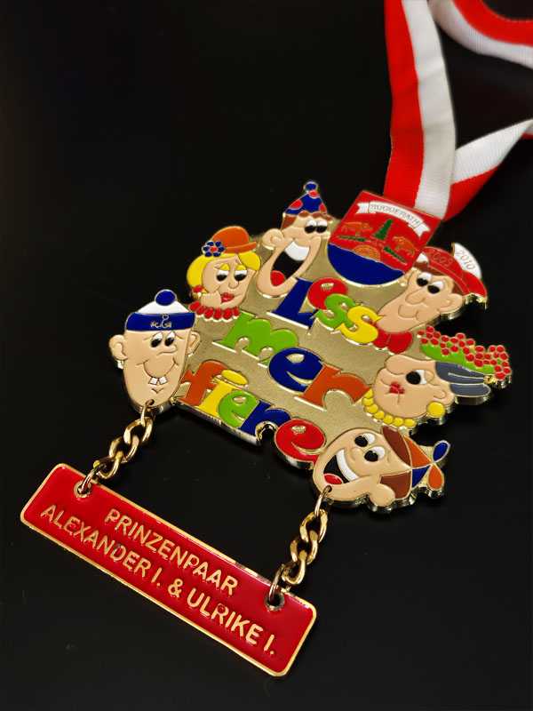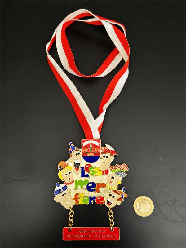 Bu tür madalyonlar, Almanya'daki geleneksel karnaval sezonlarında (Fastnacht) anı veya ödül olarak üretilen popüler koleksiyon parçalarıdır. Madalya, 2004-2005 jübile sezonu için üretilmiştir. Üzerinde "Stadprinzenpaar Jürgen I. & Rosi III." yazısı bulunmaktadır. Altın kaplama görünümü ve emaye detayları ile geleneksel bir karnaval nişanıdır.
