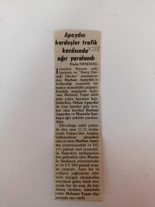İstanbul Barosu Eski Başkanı Ve Barış Derneği Davası Sanıklarından Burhan Apaydın'ın Kullandığı Otomobil Başka Bir Otomobille Çarpıştı - Silivrikapı - Bakırköy başlıklı ürün, Efemera, Müzik, Sinema > Diğer Efemera kategorisi altında İkinci El olarak satılmaktadır.