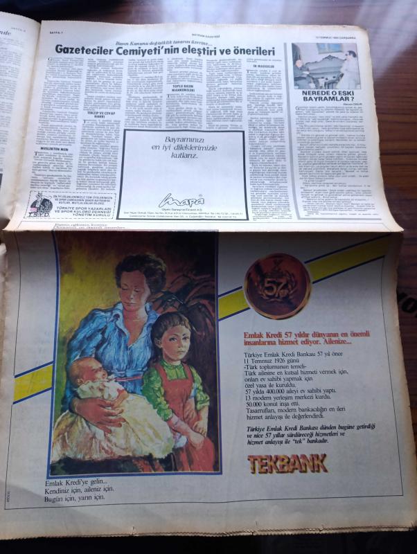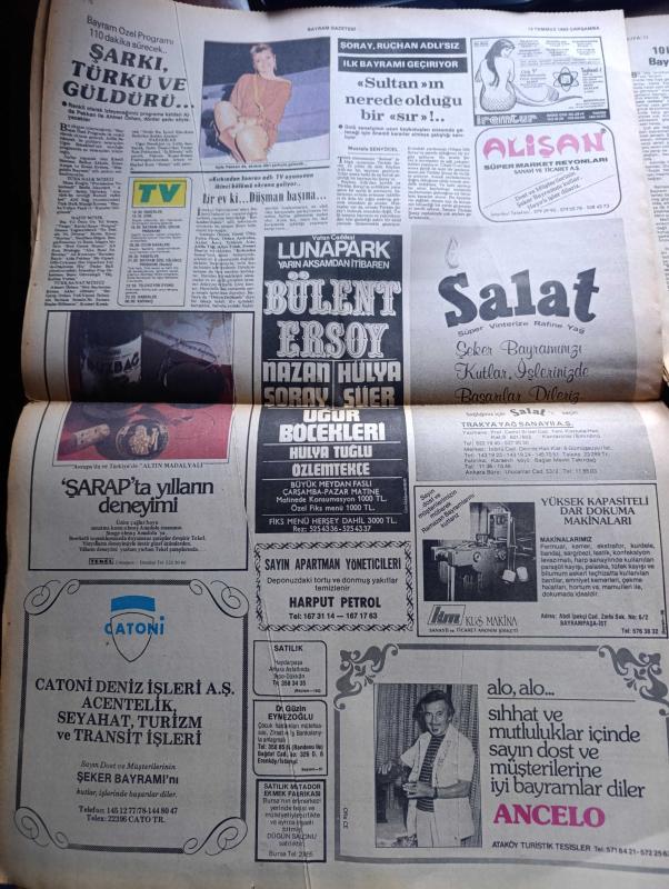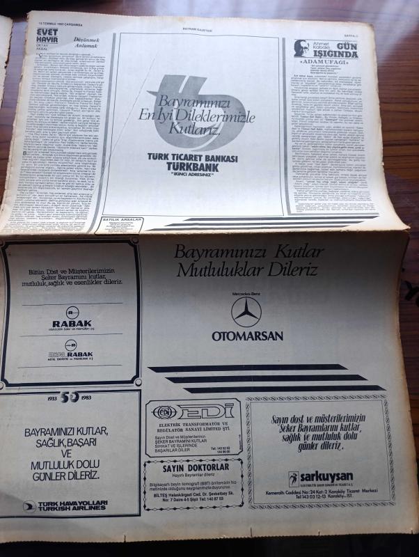 İstanbul Bayram Gazetesi - Turkish Newspaper - 13 Temmuz 1983 - erdek'te çocuklar Cumhurbaşkanı Kenan Evren'in bayramını kutladı fotoğraf - Burhan Felek ve Mustafa Yücel artık aramızda yoklar fotoğraf - İstanbul'da fiyatlar %26 arttı - basın kanunu tasarısı tartışılıyor - sağlık ve Sosyal yardım bakanı Kaya Kılıçturgay falso yapmayacağız mutlaka başarılı olacağız dedi - Mehmet Ali Ağca'nın papa suikastini soruşturan İtalyan savcı Martella sofya'da - yurt dışından gelen işçiler bayramı hareketlendirdi - kainatın en güzel kızı yeni zelandalı Lorraine Downes - düşünmek anlamak yazan Oktay Akbal - bayram tebrik mesajları - İstanbul bir müzik sarayı kazanıyor - Ajda Pekkan bayramda televizyonda Fotoğrafı - Türkan Şoray Rüçhan Adlı'sız ilk Bayramı geçiriyor - Bülent Ersoy Nazan Şoray Hülya Süer uğur böcekleri Vatan caddesi Lunapark'ta - mikrofon yazan Halit Kıvanç - Devlet tiyatroları 35 yaşında - Grundig - finlandiya'da 200 metrede şampiyon olan bayan atletimiz Semra Aksu fotoğraf adlı eser, Kitap > Süreli Yayınlar > Gazeteler > Türkiye > Genel > Günlük kategorisinde İkinci El olarak satıştadır.
