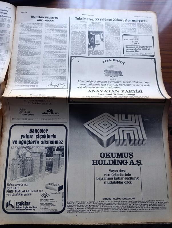 İstanbul Bayram Gazetesi Sayfa Boyutu : 42*58 cm Sayfa Sayısı: 16 Yıpranma, sararmalar, kupon kesiği ve yırtılmalar zamana bağlı olarak görülebilir Not: Tam takım gazetedir