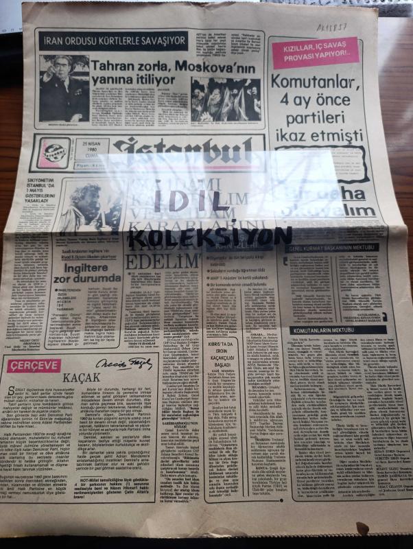 İstanbul Gazetesi - Turkish Newspaper - 25 Nisan 1980 - Kaçak yazan Necip Fazıl Kısakürek - Sıkıyönetim İstanbul'da 1 Mayıs gösterilerini yasakladı - İran ordusu Kürtlerle savaşıyor - Tahran zorla Moskova'nın yanına itiliyor - idamı kaldıralım veya idam kararlarını tasdik ederim - Anthony Thomas yaptığı filmle ingiltere'yi İslam dünyası karşısında zor duruma sokağın televizyon yapımcısı fotoğraf - kızıllar iç savaş provası yapıyor - komutanlar 4 ay önce partileri ikaz etmişti - Genelkurmay Başkanı Kenan Evren'in mektubu - Diyarbakır'da dün biri polis 4 kişi öldürüldü - solcuların vurduğu öğretmen öldü - binbir yüzlü Prens Charles fotoğraf - Süleyman Demirel özel sektörü her yönüyle destekliyor fotoğraf - Sakıp Sabancı tekstil sanayisinde Türkiye'nin 1 numaralı ismi - Vehbi Koç montaj sanayinde tek adam her dala atlıyor - Korkunun gölgesinde polisiye roman - körler de özürlüler de futbol oynar - Trabzonspor Beşiktaş maç öncesi Ahmet Suat Özyazıcı iddialı - TV programı adlı eser, Kitap > Süreli Yayınlar > Gazeteler > Türkiye > Genel > Günlük kategorisinde İkinci El olarak satıştadır.