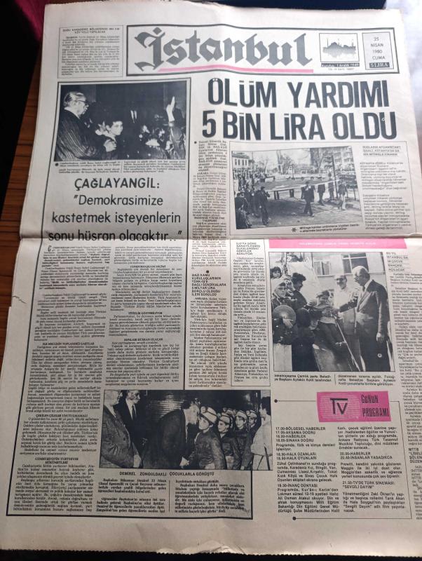 İstanbul Gazetesi - Turkish Newspaper - 25 Nisan 1980 - Kaçak yazan Necip Fazıl Kısakürek - Sıkıyönetim İstanbul'da 1 Mayıs gösterilerini yasakladı - İran ordusu Kürtlerle savaşıyor - Tahran zorla Moskova'nın yanına itiliyor - idamı kaldıralım veya idam kararlarını tasdik ederim - Anthony Thomas yaptığı filmle ingiltere'yi İslam dünyası karşısında zor duruma sokağın televizyon yapımcısı fotoğraf - kızıllar iç savaş provası yapıyor - komutanlar 4 ay önce partileri ikaz etmişti - Genelkurmay Başkanı Kenan Evren'in mektubu - Diyarbakır'da dün biri polis 4 kişi öldürüldü - solcuların vurduğu öğretmen öldü - binbir yüzlü Prens Charles fotoğraf - Süleyman Demirel özel sektörü her yönüyle destekliyor fotoğraf - Sakıp Sabancı tekstil sanayisinde Türkiye'nin 1 numaralı ismi - Vehbi Koç montaj sanayinde tek adam her dala atlıyor - Korkunun gölgesinde polisiye roman - körler de özürlüler de futbol oynar - Trabzonspor Beşiktaş maç öncesi Ahmet Suat Özyazıcı iddialı - TV programı, Kemal Uzan tarafından kaleme alınmıştır. İstanbul Gazetesi - Turkish Newspaper - 25 Nisan 1980 - Kaçak yazan Necip Fazıl Kısakürek - Sıkıyönetim İstanbul'da 1 Mayıs gösterilerini yasakladı - İran ordusu Kürtlerle savaşıyor - Tahran zorla Moskova'nın yanına itiliyor - idamı kaldıralım veya idam kararlarını tasdik ederim - Anthony Thomas yaptığı filmle ingiltere'yi İslam dünyası karşısında zor duruma sokağın televizyon yapımcısı fotoğraf - kızıllar iç savaş provası yapıyor - komutanlar 4 ay önce partileri ikaz etmişti - Genelkurmay Başkanı Kenan Evren'in mektubu - Diyarbakır'da dün biri polis 4 kişi öldürüldü - solcuların vurduğu öğretmen öldü - binbir yüzlü Prens Charles fotoğraf - Süleyman Demirel özel sektörü her yönüyle destekliyor fotoğraf - Sakıp Sabancı tekstil sanayisinde Türkiye'nin 1 numaralı ismi - Vehbi Koç montaj sanayinde tek adam her dala atlıyor - Korkunun gölgesinde polisiye roman - körler de özürlüler de futbol oynar - Trabzonspor Beşiktaş maç öncesi Ahmet Suat Özyazıcı iddialı - TV programı adlı eser Türkçe dilindedir.