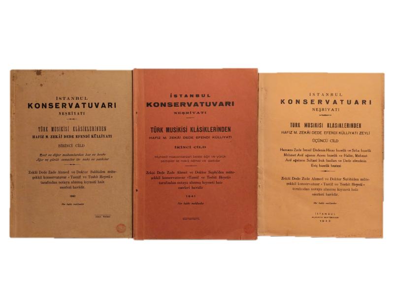 [3 CİLT TAKIM] Zekâi Dede Zade Ahmed ve Doktor Subhiden müteşekkil konservatuvar tarafından notaya alınmış kıymeti haiz eserleri havidir. * İstanbul Konservatuvarı Neşriyatı Türk Musikisi Klasiklerinden Hafız M. Zekâi Dede Efendi Külliyatı I: Rast ve diğer makamlardan kar ve beste Ağır ve yürük semailer ile nakş ve şarkılar * İstanbul Konservatuvarı Neşriyatı Türk Musikisi Klasiklerinden Hafız M. Zekâi Dede Efendi Külliyatı II: Muhtelif makamlardan beste ağır ve yürük semailer ile nakş semai ve şarkılar * İstanbul Konservatuvarı Neşriyatı Türk Musikisi Klasiklerinden Hafız M. Zekâi Dede Efendi Külliyatı Zeyli III: Hamamı Zade İsmail Dedenin Hicaz buselik ve Saba buselik Mehmet Arif ağanın Acem buselik ve Halim, Mehmet Arif ağaların Sultanî Irak fasılları ve Dede efendinin Eviç buselik bestesi *