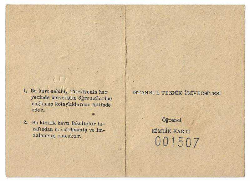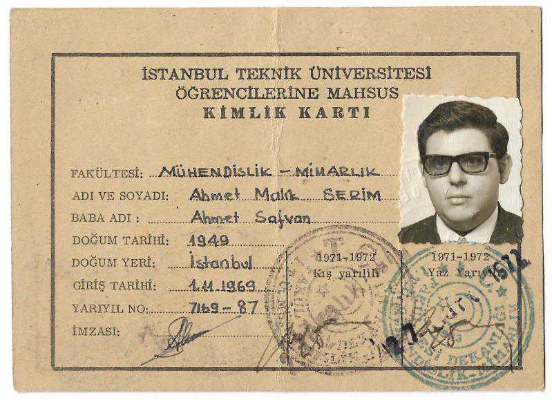 İstanbul Teknik Üniversitesi öğrencilerine mahsus kimlik kartı, Ahmet Malik Serim Adına, 1971-1972 yılına ait, damgalı.