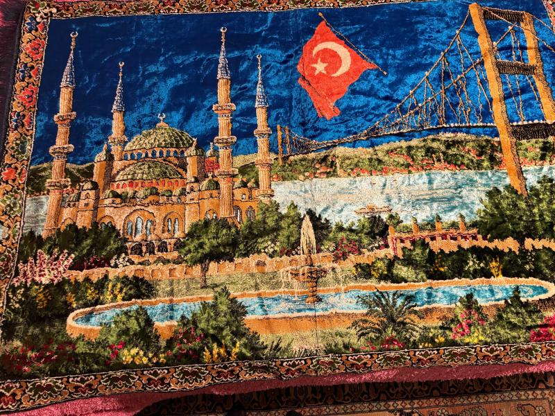 İstanbul Temalı Kadife Duvar Halısı 170x115 cm Üzerinde Sultanahmet Camii, Boğaz Köprüsü ve Türk Bayrağı işlemeleri bulunan çok şık bir dekoratif halıdır. Canlı renklere sahip, yumuşak kadife dokuludur. Işığa göre renk değiştiren parlak bir yapısı vardır. Temiz kullanılmış, yırtığı veya söküğü yoktur. başlıklı antika/koleksiyon objesi Türkiye menşe’lidir. Objenin ait olduğu dönem bilinmeketedir.