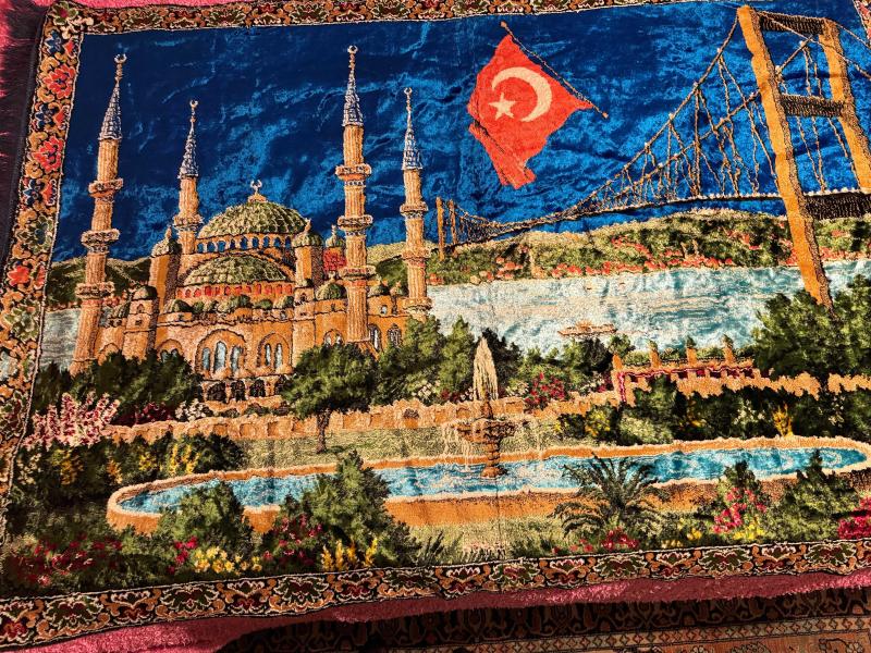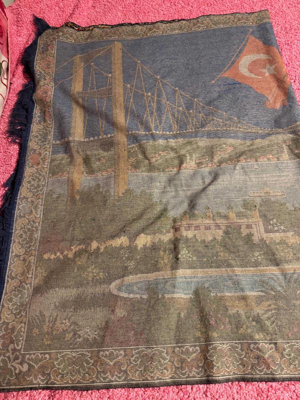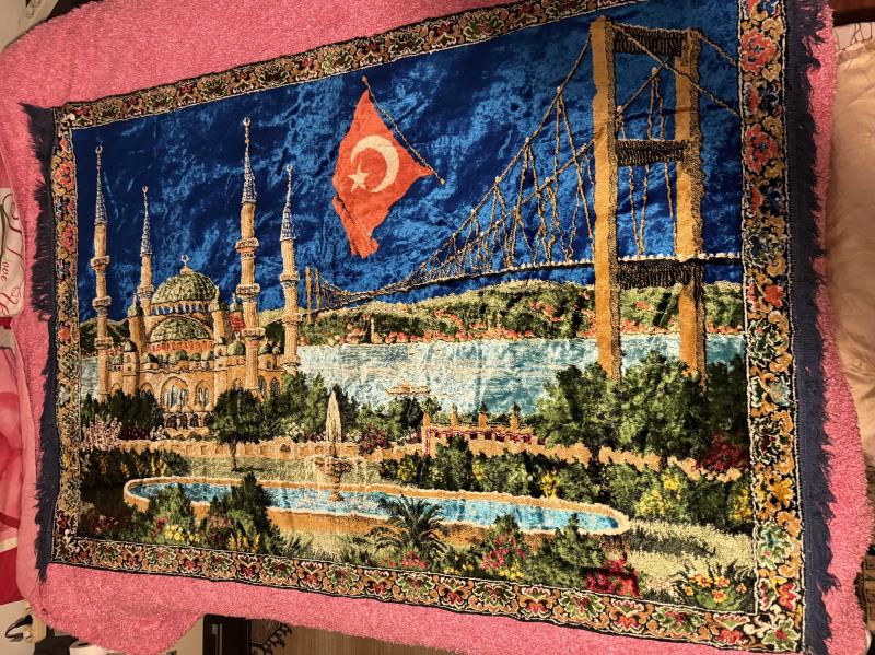 İstanbul Temalı Kadife Duvar Halısı 170x115 cm Üzerinde Sultanahmet Camii, Boğaz Köprüsü ve Türk Bayrağı işlemeleri bulunan çok şık bir dekoratif halıdır. Canlı renklere sahip, yumuşak kadife dokuludur. Işığa göre renk değiştiren parlak bir yapısı vardır. Temiz kullanılmış, yırtığı veya söküğü yoktur.