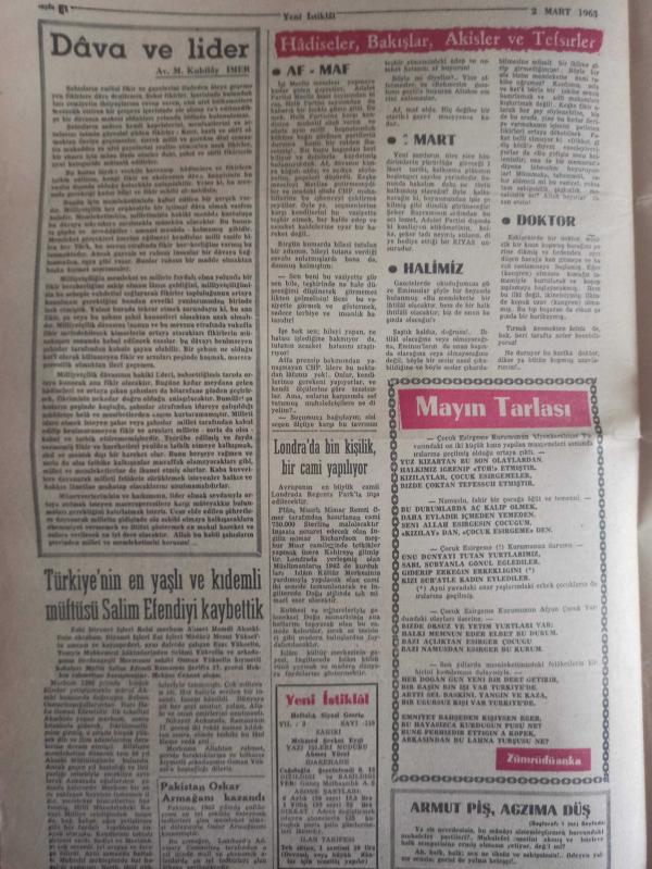 İstiklal Haftalık Siyasi Tarafsız Gazete - 2 Mart 1963 - Sayı:114 - Beklediğimiz Bayram - Bayram Nasıl Geçti - Bir İstismar Örneği - Kız Gibi - Mehmet Coşar - Bedüzzaman S. Nursi'nin Hayatı - Müdafaa, Karar Sepha, Son Söz - İstiklal Mahkemesi Mahkumlarından Birkaçı - Dava ve Lider - Kubilay İmer - Hadiseler, Bakışlar, Akisler ve Tefsirler - Mayın Tarlası - Erzurum'da Domuz Eti Yemek Mubahmış! - Rusya'da Komünistler Nasıl İktidara Geçtiler - İmam Hatip Okullarındaki Boykot Hadiselerinin İç Yüzü - Adil Özgüç - Bedir Yayınevindeki Kitaplar - Hürriyetsiz Diyanet Olamaz! - İmanlıların Komünistlere Karşı Zaferi - Yusuf Demirdağ - Beklediğimiz Bayram fotoğraf ve haberi - Tam Takım Gazete, Mahir İz tarafından kaleme alınmıştır. Kitap 1963 yılında Sönmez Neş. ve Mat. tarafından [İstanbul] yayınlanmıştır. 8 sayfadır. İstiklal Haftalık Siyasi Tarafsız Gazete - 2 Mart 1963 - Sayı:114 - Beklediğimiz Bayram - Bayram Nasıl Geçti - Bir İstismar Örneği - Kız Gibi - Mehmet Coşar - Bedüzzaman S. Nursi'nin Hayatı - Müdafaa, Karar Sepha, Son Söz - İstiklal Mahkemesi Mahkumlarından Birkaçı - Dava ve Lider - Kubilay İmer - Hadiseler, Bakışlar, Akisler ve Tefsirler - Mayın Tarlası - Erzurum'da Domuz Eti Yemek Mubahmış! - Rusya'da Komünistler Nasıl İktidara Geçtiler - İmam Hatip Okullarındaki Boykot Hadiselerinin İç Yüzü - Adil Özgüç - Bedir Yayınevindeki Kitaplar - Hürriyetsiz Diyanet Olamaz! - İmanlıların Komünistlere Karşı Zaferi - Yusuf Demirdağ - Beklediğimiz Bayram fotoğraf ve haberi - Tam Takım Gazete adlı eser Türkçe dilindedir.