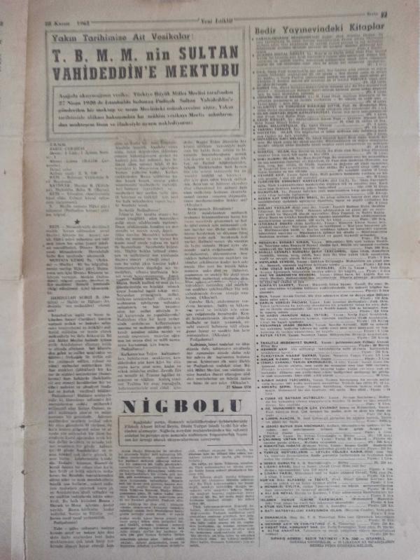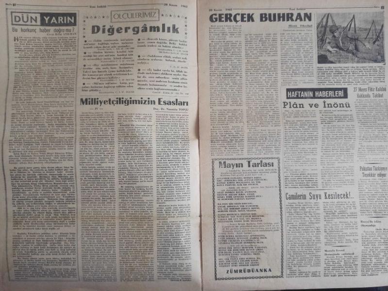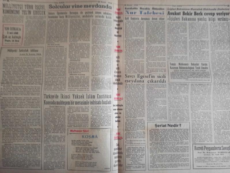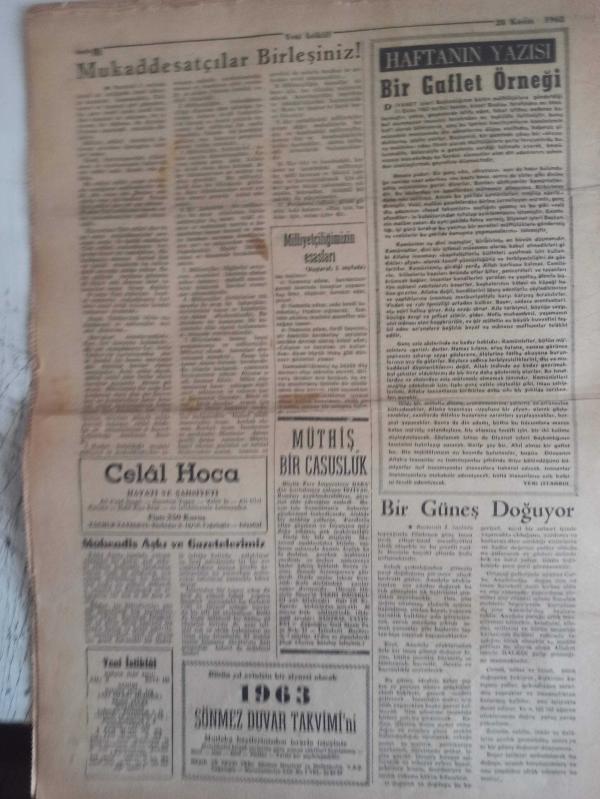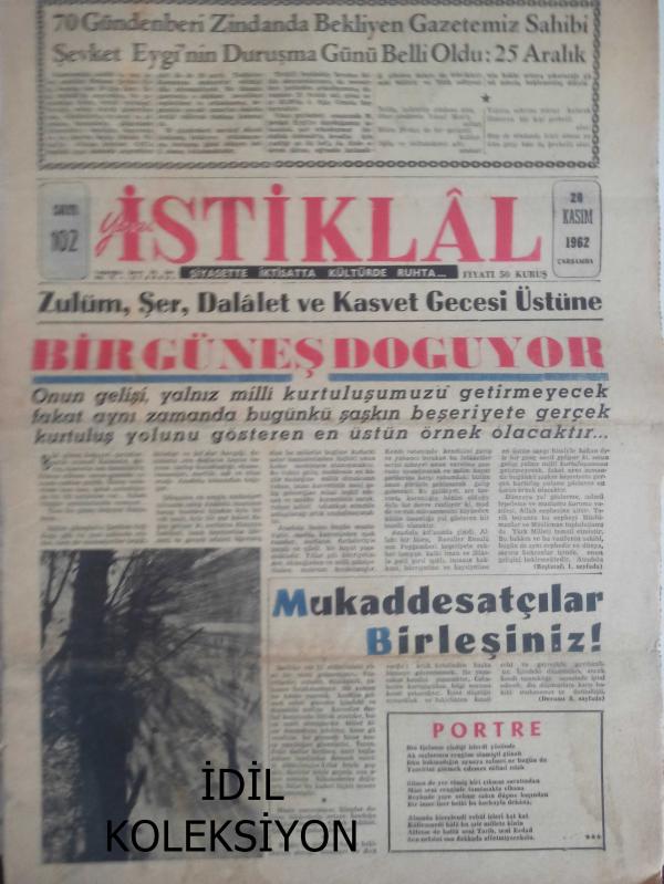 İstiklal Haftalık Siyasi Tarafsız Gazete - 29 Kasım 1962 - Sayı:102 - Bir Güneş Doğuyor - Mukaddesatçılar Birleşiniz! - Portre - Dün Yarın - Bu Korkunç Haber Doğru Mu? - Diğergamlık - Milliyetçiliğimizin Esasları - Nurettin Topçu - Gerçek Buhran - Hüsnü Dikeçligil - Plan ve İnönü - Camilerin Suyu Kesilecek! - Mayın Tarlası - Solcular Yine Meydanda - Milliyetçi Türk İşçisi, Komünizmi Tel'in Edecek - Milliyetçi Solculuk İddiası - Türkiye'de İkinci Yüksek İslam Enstitüsü Konya'da Muhteşem Bir Merasimle Tedrisata Başladı - Savcı Egesel'in Sicili Meydana Çıkarıldı - Şeriat Nedir? - Nur Talebesi - Maarif Faciası - Yunus Emre Hassasiyeti - Necip Fazıl Kısakürek - Nigbolu - Mukaddesatçılar Birleşiniz! - Bir Gaflet Örneği - Celal Hoca - Müthiş Bir Casusluk - Bir Güneş Doğuyor - Mühendis Aşkı ve Gazetelerimiz fotoğraf ve haberi - Tam Takım Gazete Yıpranma, sararmalar, kupon kesiği ve yırtılmalar zamana bağlı olarak görülebilir