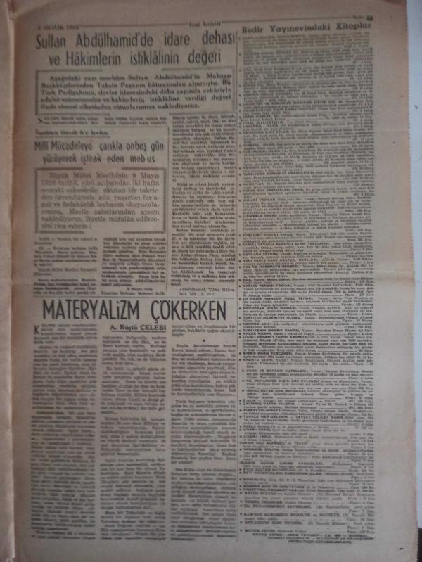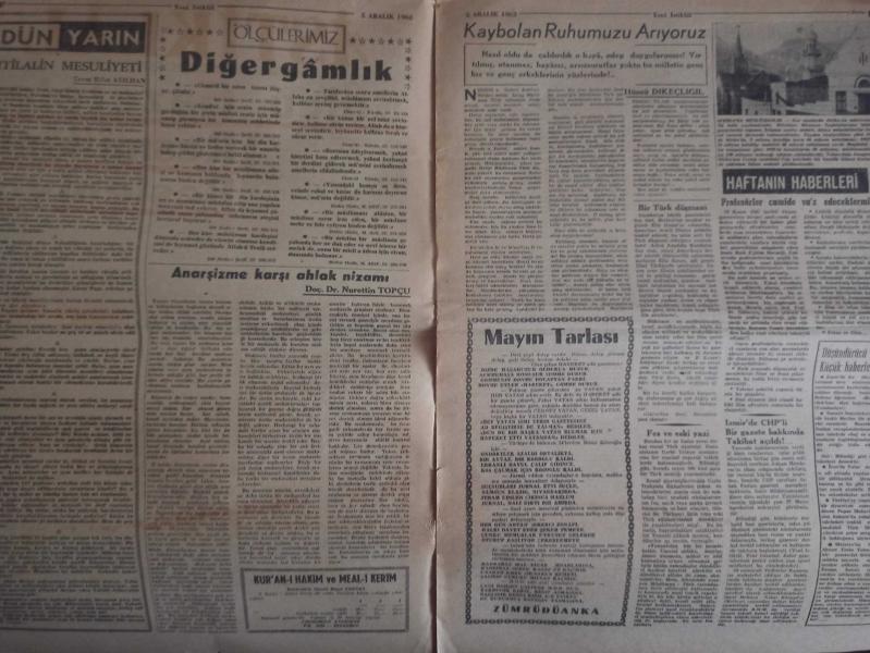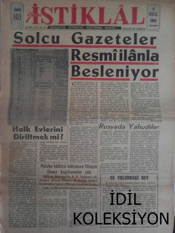 İstiklal Haftalık Siyasi Tarafsız Gazete - 5 Aralık 1962 - Sayı:103 - Solcu Gazeteler Resmi İlanla Besleniyor - Halk Evlerini Diriltmek Mi? - Rusya'da Yahudiler - Su Yolundaki Dev - İhtilalin Mesuliyeti - Cevat Rıfat Atılhan - Diğergamlık - Anarşizme Karşı Ahlak Nizamı - Nurettin Topçu - Kaybolan Ruhumuzu Arıyoruz - Mayın Tarlası - Komünizm Müdafileri - Hıfzı Oğuz Bekata - Nurculuk Meselesi - Haftanın Şiiri Naat - Yunus Emre Hassasiyeti - Necip Fazıl Kısakürek - Zinde Kuvvetler Eğleniyor - Raşit Bidar - Materyalizm Çökerken - Rüştü Çelebi - Bedir Yayınevindeki Kitaplar - İki Kafa Örneği - Onlarda ve Bizde Nasıl Yetişiyorlar ? - Haftanın Yazısı Kırbaç - Arif Nihat Asya fotoğraf ve haberi - Tam Takım Gazete Yıpranma, sararmalar, kupon kesiği ve yırtılmalar zamana bağlı olarak görülebilir