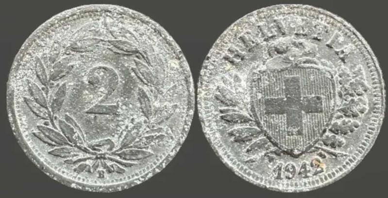 İsviçre 2 Rappen 1942 Çinko Doğal Koyu Gri Renk. II. Dünya Savaşı Dönemi, 9 ay önce satışa sunulmuştur.