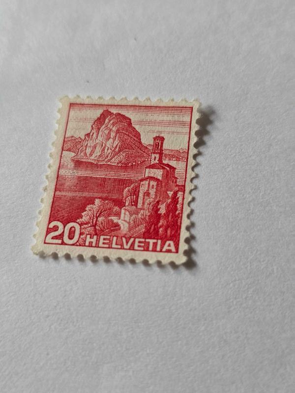 Değer: 20 (Para veya Centimes olması muhtemeldir, arama sonuçlarında "20 PARA" geçtiği görülüyor, ancak bu pulun ait olduğu seride genellikle 20 Centimes olarak basılmıştır). Konu (Tema): Pul, Lugano Gölü kıyısında bulunan Castagnola Kilisesi'ni ve arka planda yükselen Monte San Salvatore Dağı'nı tasvir etmektedir. Kırmızı renkte, gravür tekniği ile yapılmış bir çizime sahiptir. Seri: Bu pul, İsviçre'nin ünlü "Manzara ve Anıtlar" serisinin bir parçasıdır. Emisyon yılı: 1938