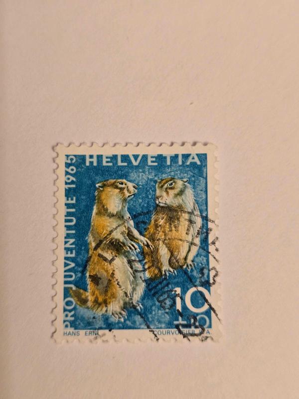 Seri/Amaç: Pul, İsviçre'de gençlik refahı için fon sağlamak amacıyla her yıl çıkarılan bir yardım pulu serisi olan "Pro Juventute" serisine aittir. Tasarım: Pulun üzerinde, mavi bir zemin üzerinde ayakta duran ve birbirine bakan iki adet dağ sıçanı (Marmot) resmi bulunmaktadır. Ülke: Pulun üst kısmında belirtilen HELVETIA (İsviçre'nin Latince adı) ibaresi İsviçre'ye ait olduğunu gösterir. Değer: Pulun üzerinde, bir kısmı mürekkeple kapatılmış olsa da, nominal değeri 10+10 centimes (veya rappen) olarak okunmaktadır. Buradaki ikinci '10' kısmı, yardım pulu olduğu için gençlik refahı fonuna giden ek ücreti temsil eder. Sanatçı/Gravürcü: Pulun alt kısmında HANS ERNI (sanatçı) ve COURVOISIER S. A. (baskı evi) isimleri yer almaktadır. Emisyon Yılı: 1965