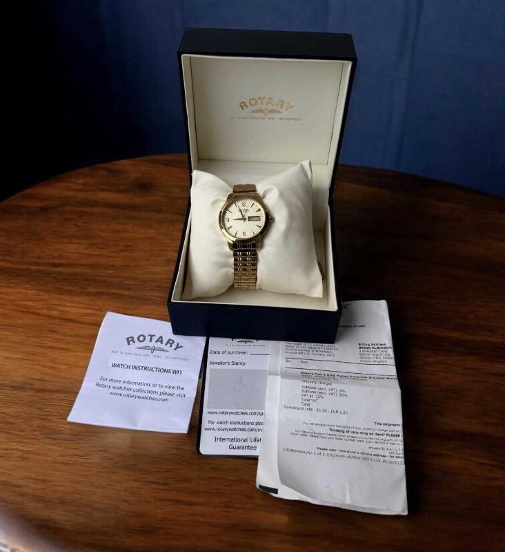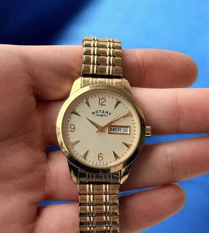 Klasik İsviçre saatçiliğinin modern bir yansıması… 1895 yılında İsviçre’de kurulan ROTARY, özellikle İngiltere pazarı için ürettiği modellerle tanınan, köklü ve saygın bir markadır. Bu özel parça, 2012 yılında İngiltere’den satın alınmış, orijinal kutusu, kullanım kılavuzu, garanti ve fatura evraklarıyla birlikte günümüze ulaşmıştır. Altın tonlu kasası, sade ama karakterli kadranı ve gün–tarih penceresi ile hem günlük kullanım hem de koleksiyon için son derece dengeli bir modeldir. Bilekte duruşu iddialı ama abartısızdır — Rotary’nin “zamansız” çizgisini net şekilde yansıtır. Ürün Özellikleri Marka: Rotary Üretim: İsviçre Satış: 2012 / İngiltere Kasa Çapı: ≈ 40 mm (erkek standart ölçü) Kasa & Bilezik: Gold kaplama Kadran: Krem / açık ton Fonksiyon: Gün & tarih göstergesi Mekanizma: Quartz Cam: Mineral Durum: Çok temiz, bakımlı Kutu & Evrak: ✅ Orijinal kutu, kullanım kılavuzu, garanti & fatura mevcut