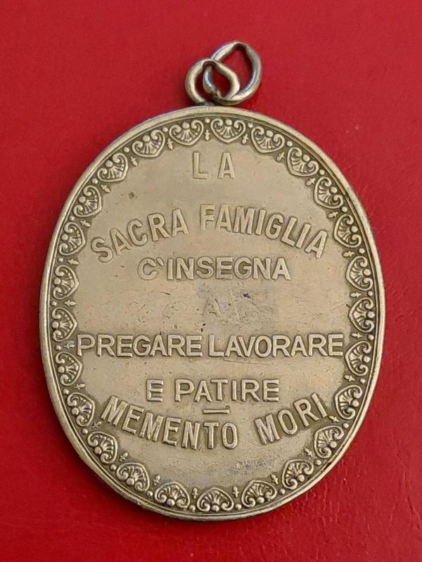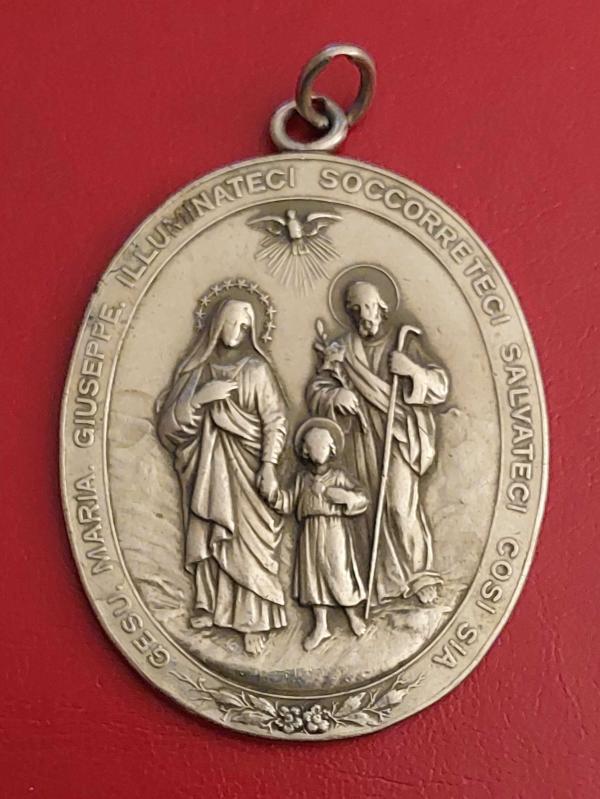 İtalya, Kutsal Aile'ye Adanmıştır. İsa, Meryem, Yusuf ve Dua Temalı Kutsal Madalyon. Mükemmel Detaylara Sahiptir. Kullanılmış/Patinalı. Gumüş Tonlu Metal. Büyük Boy-Oval. (74 gr/54x66 cm)