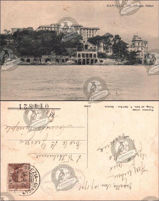 İtalya, Rapallo, Kartpostal, 1920’ler: Deniz kıyısında Casino Hotel ve teraslı yapı kompleksi, arka planda ağaçlık tepe; arkası pullu ve damgalı, postadan geçmiş., bir ay önce satışa sunulmuştur.