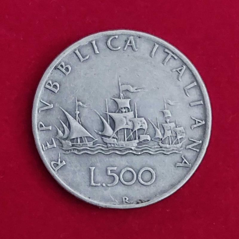 İtalya, "Repvbblica Italiana" 500 Lire 1960 R. Ön Yüz: Sağa Doğru Yelken Açan Üç Karavel Yer Alır/Niña, Pinta, Santa Maria (Kolomb'un Batı Hint Adaları'na Yaptığı Yolculukta Kullanılan Gemiler) Temalı Hatıra Para. Arka Yüz: Dönemin Bölgesel Başkentlerini Temsil Eden 19 Armanın Çevrelediği Rönesans Tarzı Bir Kadın Büstü Yer almaktadır. Tasarımcı Adı Pietro Giampaoli. (Roma Darphanesi) 835 Ayar Gümüş (10,92 gr/30 mm) ÇT.