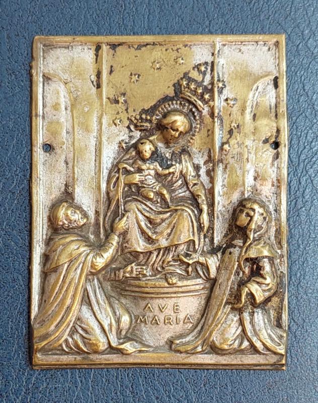 İtalya, Vintage Meryem Ana ve Çocuk İsa Dini Temalı Rölyef Plaka (Minyatür Kitap Tipi Papaz Tesbih Kutusu Kapağıdır.) Pirinç. 1900'ler.