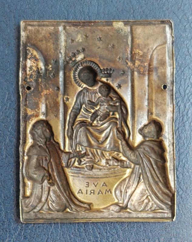 İtalya, Vintage Meryem Ana ve Çocuk İsa Dini Temalı Rölyef Plaka (Minyatür Kitap Tipi Papaz Tesbih Kutusu Kapağıdır.) Pirinç. 1900'ler. başlıklı antika/koleksiyon objesi Avrupa menşe’lidir. 1900-1949 arası dönemine aittir.