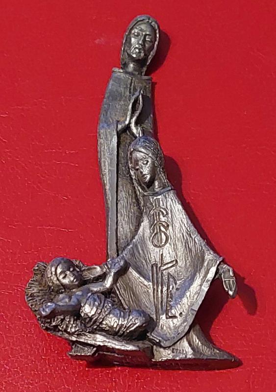 İtalya, Yusuf, Meryem ve Bebek İsa'nın Doğuşu Temalı Minyatür Heykel. Kabartmalı Döküm Kalay. 1980'ler.