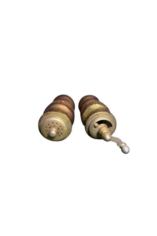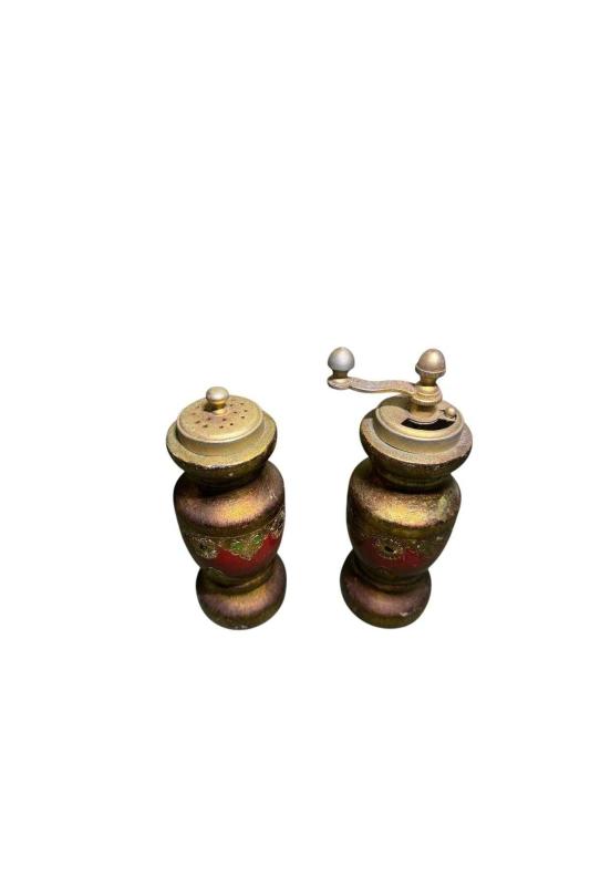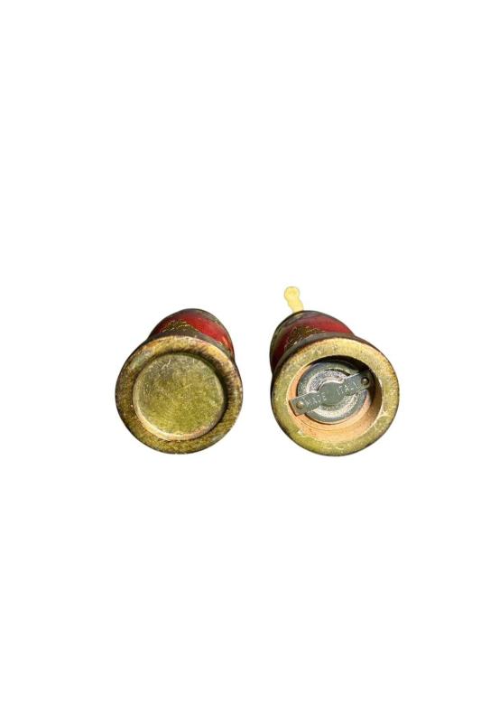 İtalyan ahşap üzeri el boyama ve pirinç aksamlı tuzluk ve karabiber değirmenin 14 cm civarı boylarda başlıklı antika/koleksiyon objesinin menşei belirtilmemiştir. Objenin ait olduğu dönem bilinmeketedir.