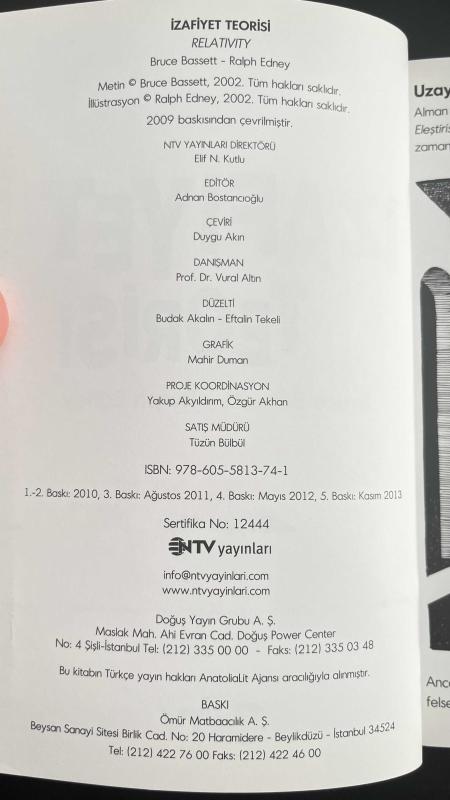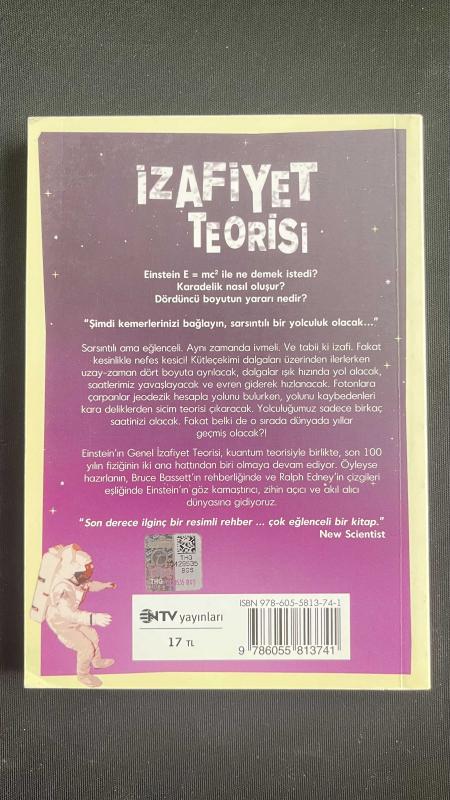 İzafiyet Teorisi: Einstein'in En Önemli Keşfi İçin Çizgibilim - Bruce Bassett, Ralph Edney - NTV Yayınları, Bruce Bassett, Ralph Edney tarafından kaleme alınmıştır. Eser Adnan Bostancıoğlu editörlüğünde hazırlanmıştır. Kitap 2013 yılında NTV Yayınları tarafından [İstanbul] 9786055813741 ISBN kodu ile yayınlanmıştır. Satışta olan kitap, yayınevinin 5. baskısıdır. Bu baskının çevirisi Duygu Akın tarafından yapılmıştır. 176 sayfadır. Sayfa bilgisi Kuşe Kağıt olarak belirtilmiştir. İzafiyet Teorisi: Einstein'in En Önemli Keşfi İçin Çizgibilim - Bruce Bassett, Ralph Edney - NTV Yayınları adlı eser Türkçe dilindedir.